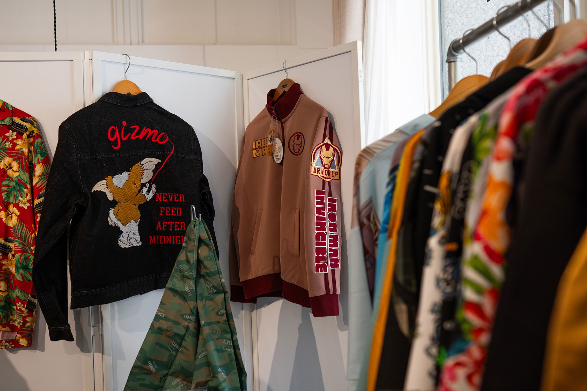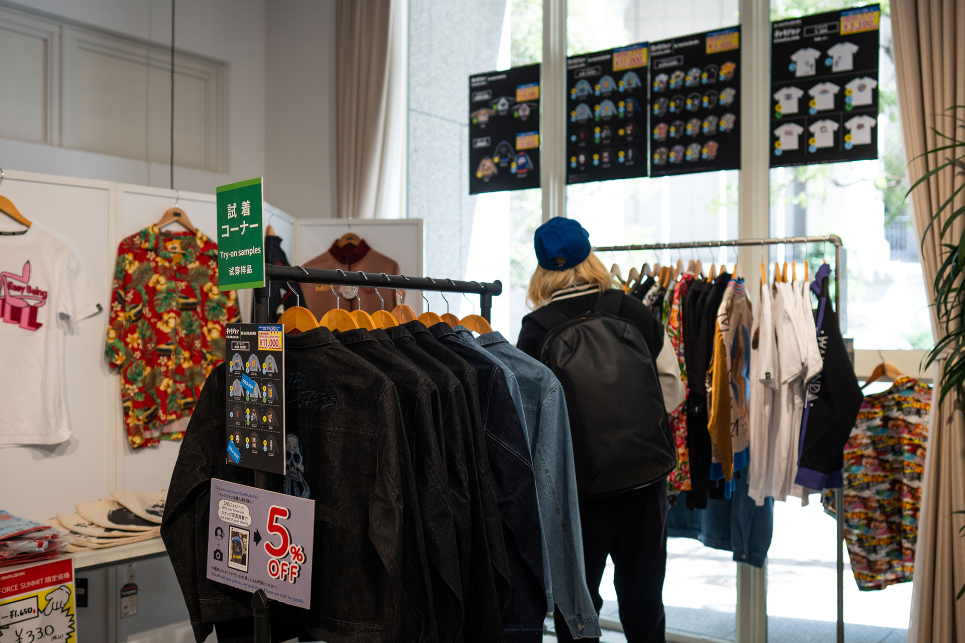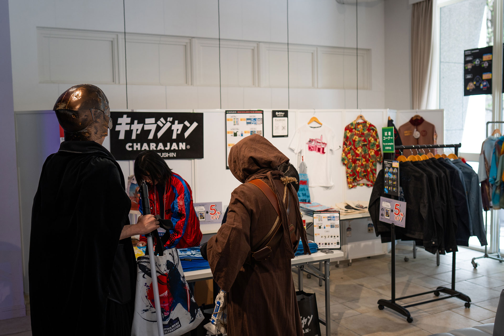 屋内会場「スタジオダヴィンチ」では、ポップカルチャーをテーマにしたジャケットやアロハシャツを手がける「キャラジャン」が出展。“特別価格”に惹かれ、つい手が伸びてしまいます。