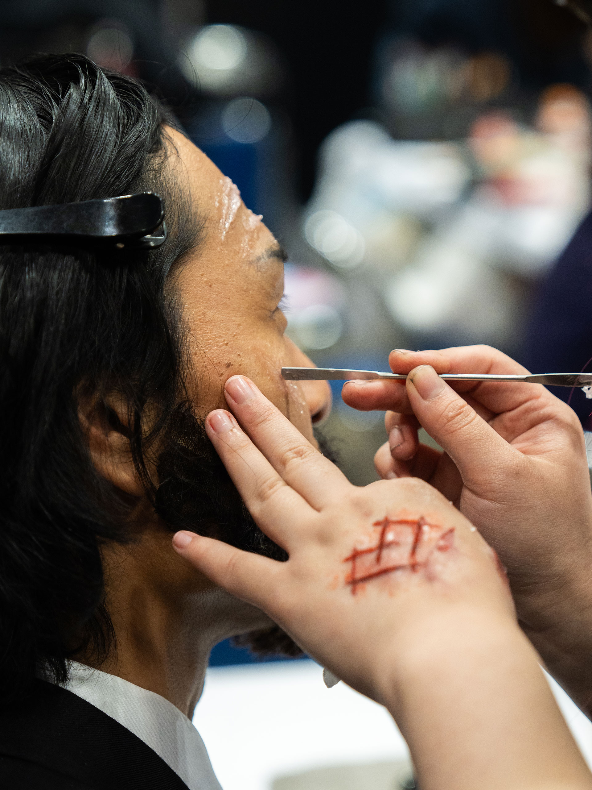 スーパーライドエリアに出展していた、特殊メイク造形スクールAmazing School JURによる「傷メイク体験」のブース。この日は、ジョン・ウィックのコスプレイヤーさんが、コスプレの“仕上げ”として利用されていたところをキャッチ。約10分と短い時間で本格的な傷メイクを体験できる場になっていました。