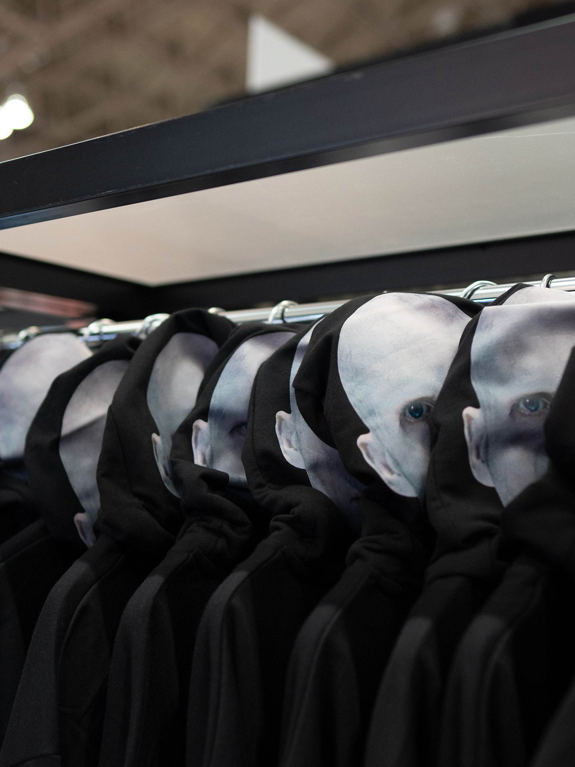 デザイン性の高い『ストレンジャー・シングス』やクリスマスムードたっぷりな『グレムリン』のアパレルが揃っていたgraniph。フードを被るとヴォルデモート卿になれるパーカーが秀逸でした。