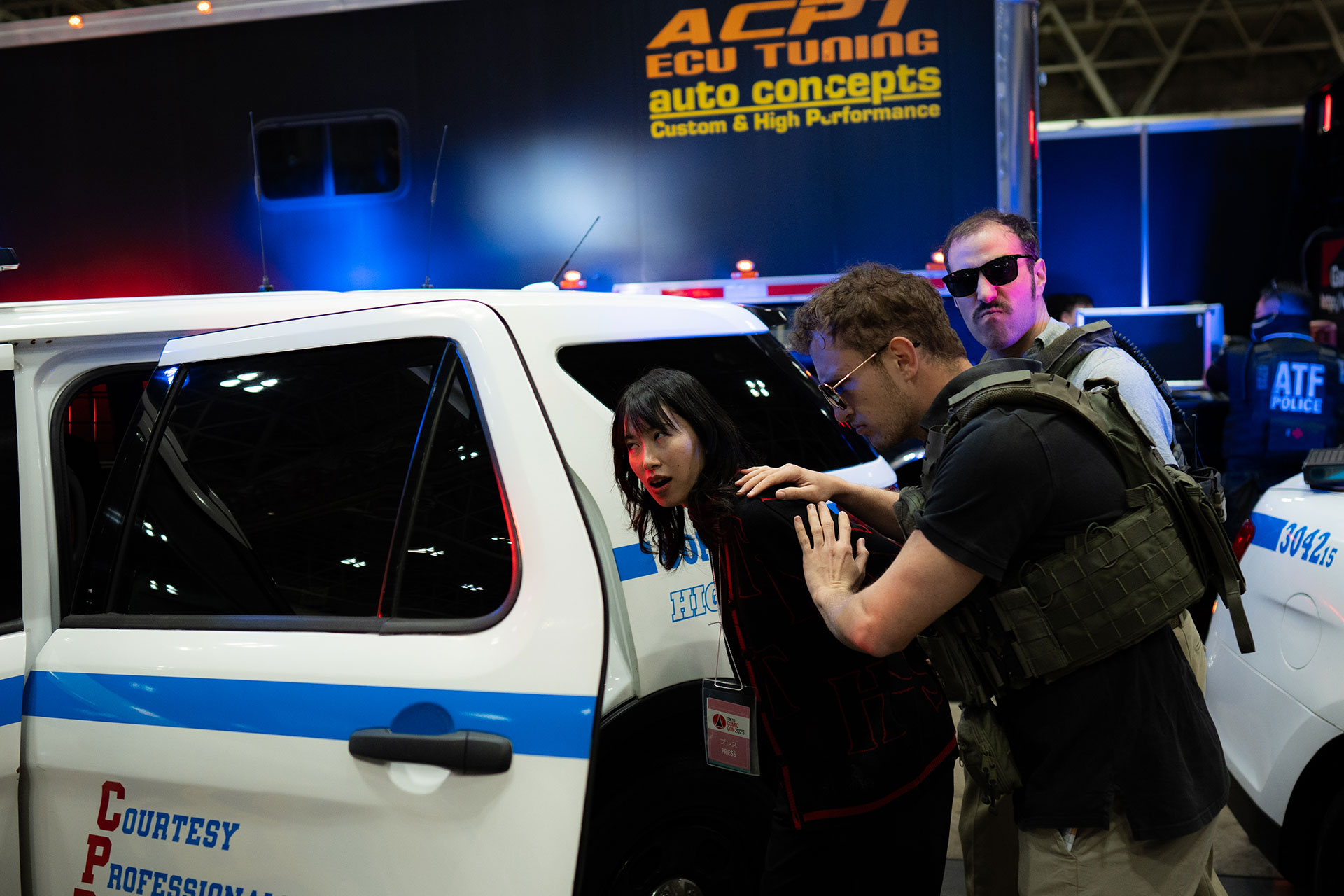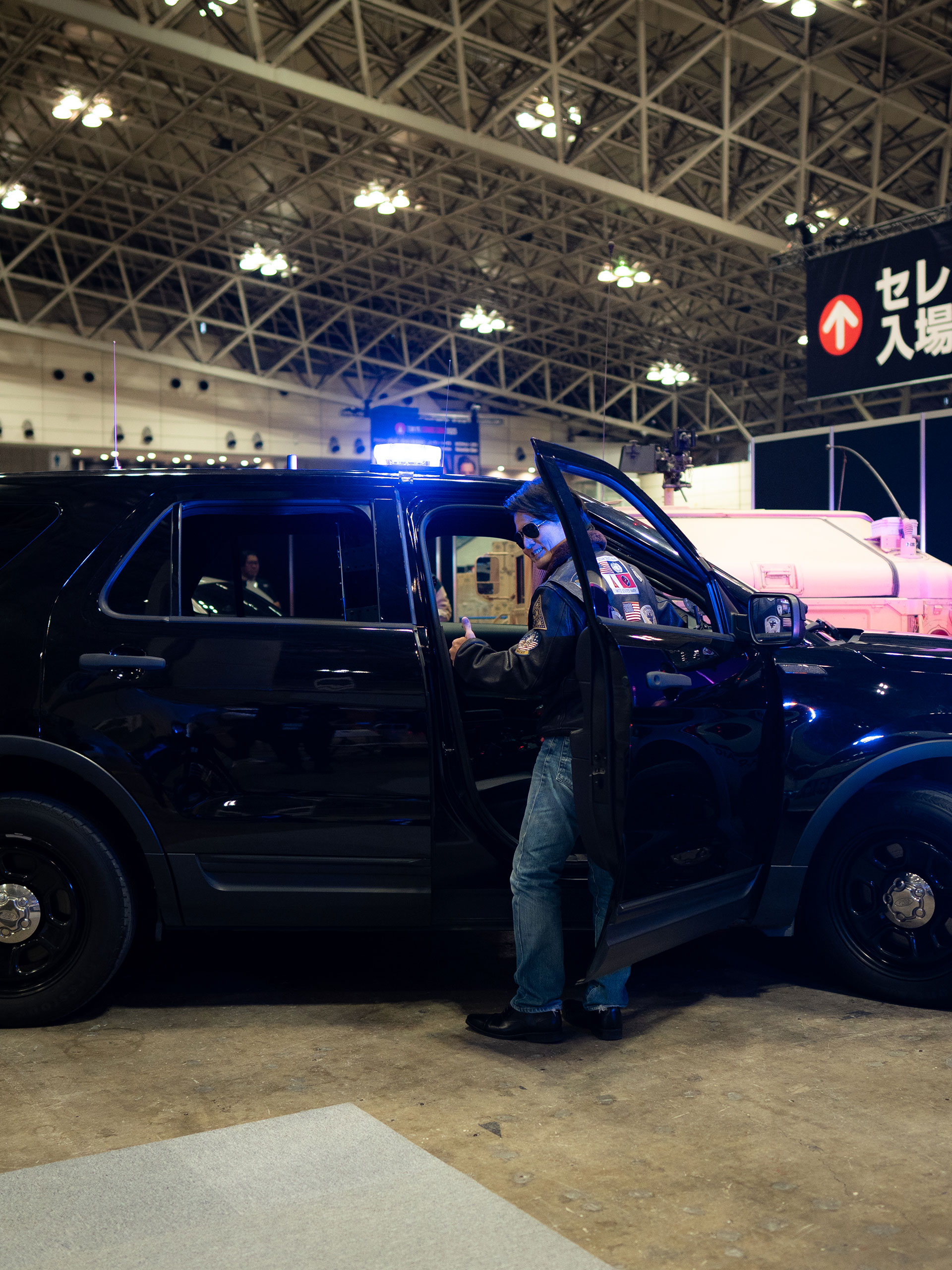 大阪コミコンでも体験できた、スーパーライドエリアのアメリカンポリスカーコーナーがパワーアップ! 自身もポリスオフィサーになりきれたり、逮捕される気分を味わえます。スペシャルゲストは、前回のジャッキーちゃん(@jackiechan_jp)に加え、琉球トム・クルーズ(@ryukyutom0220)! 「Danger Zone」がBGMで流れるなか、皆“マーヴェリック”ではなく“トム”と呼んでいたことなど、色々と愉快なブースでした。