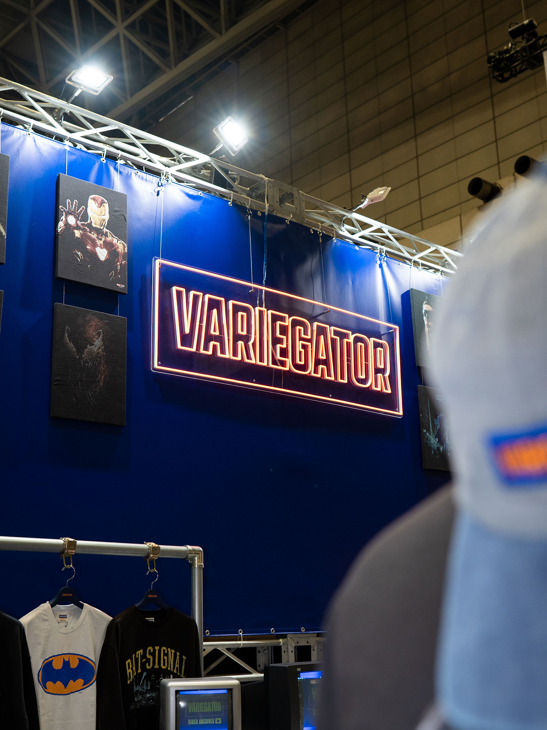 古き良きレンタルビデオ店をコンセプトにしたアパレルブランドVARIEGATORが東京コミコンに初出店。素材の質感やパッケージなどディテールにこだわっており、ファッショナブルにキャラものを身につけたい欲を満たしてくれるブランドでした。なお、MARVEL/STAR WARS POPUPにも、特別にコーナーが設けられていました!