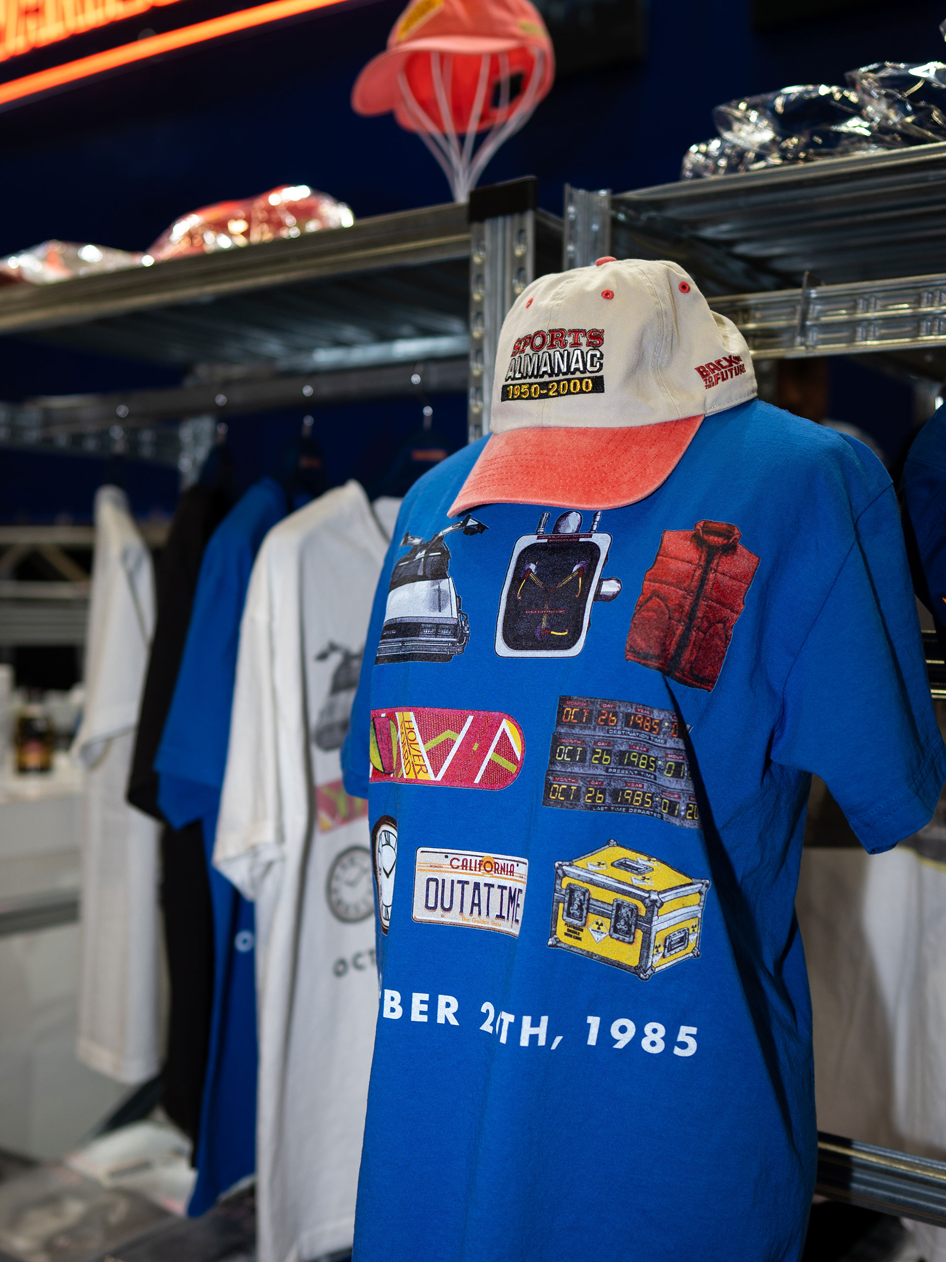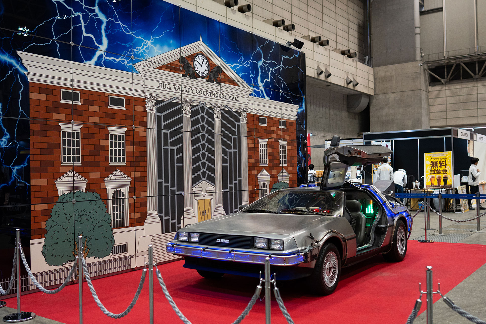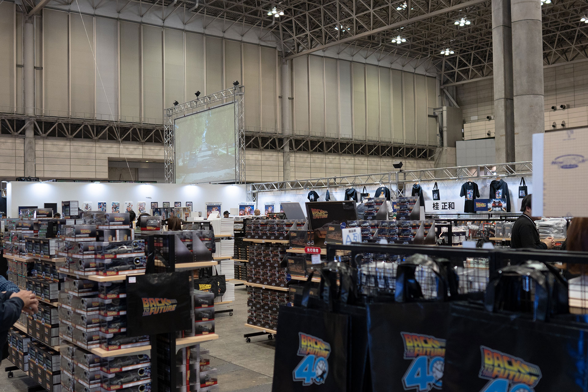 大々的に展開されていた、『バック・トゥ・ザ・フューチャー』(以下、BTTF)公開40周年記念ブース。日本人アーティストとのコラボレーションアートの展示をはじめ、ギブソンの作品トリビュートモデル、スポーツ年鑑といった劇中の小道具などが展示されており、大量のグッズが販売されていました。8,800円以上購入すれば、デロリアンと記念撮影も可能に。